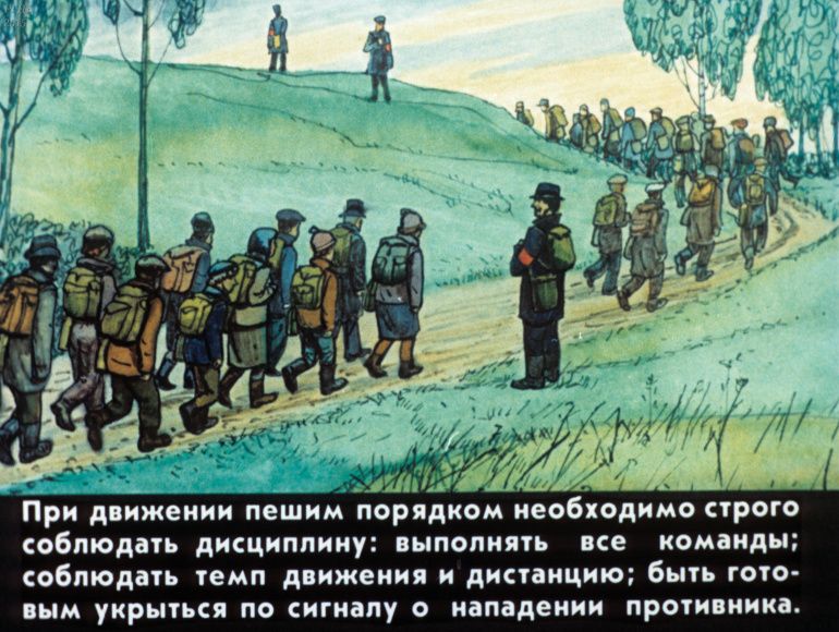 При движении пешим порядком необходимо строго соблюдать дисциплину: выполнять все команды; соблюдать темп движения и дистанцию; быть готовым укрыться по сигналу о нападении противника.