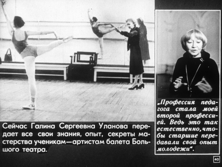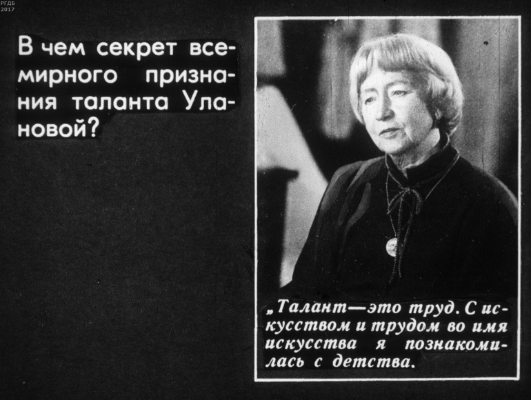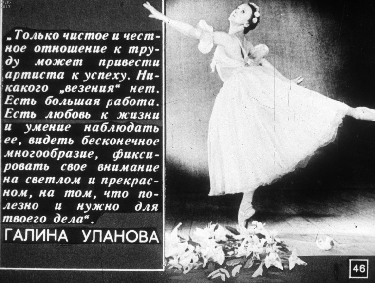 Галина Уланова 0 Категория: ДиафильмыПросмотры: 408 Диафильм "Галина Уланова". Артистка балета, народный артист СССР, лауреат Ленинской и Государственной премийСтудия "Диафильм" Госкино СССР, 1985 год. Д-011-85, черно-белый 0-20 копеек