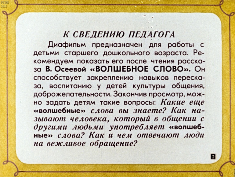 Волшебное слово 5 Категория: ДиафильмыПросмотры: 3 502 В. Осеева. Диафильм "Волшебное слово".Студия "Диафильм" Госкино СССР, 1986 год. Д-203-86, цветной 0-30 копеек
