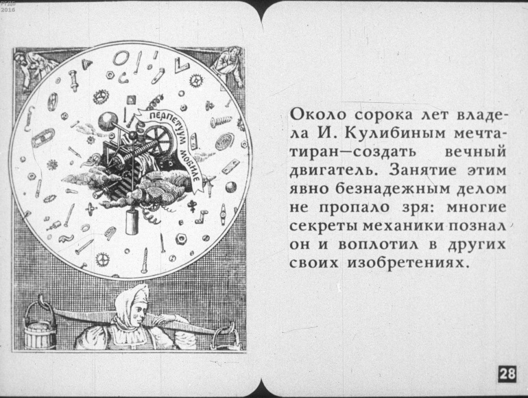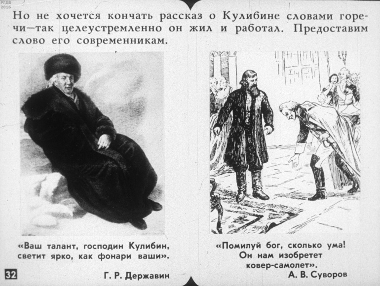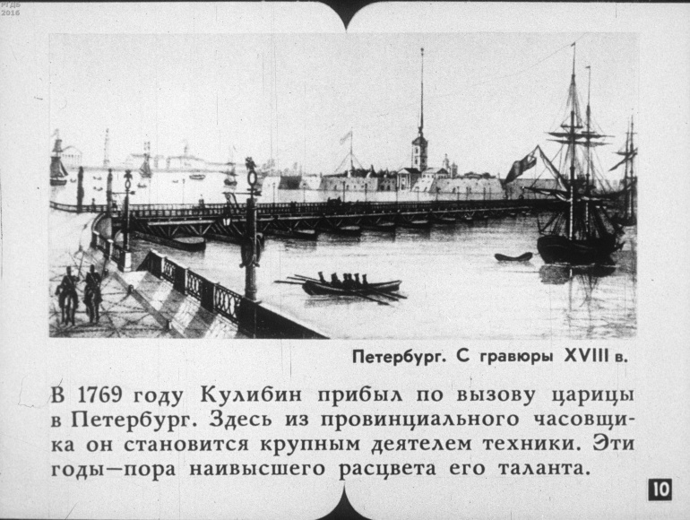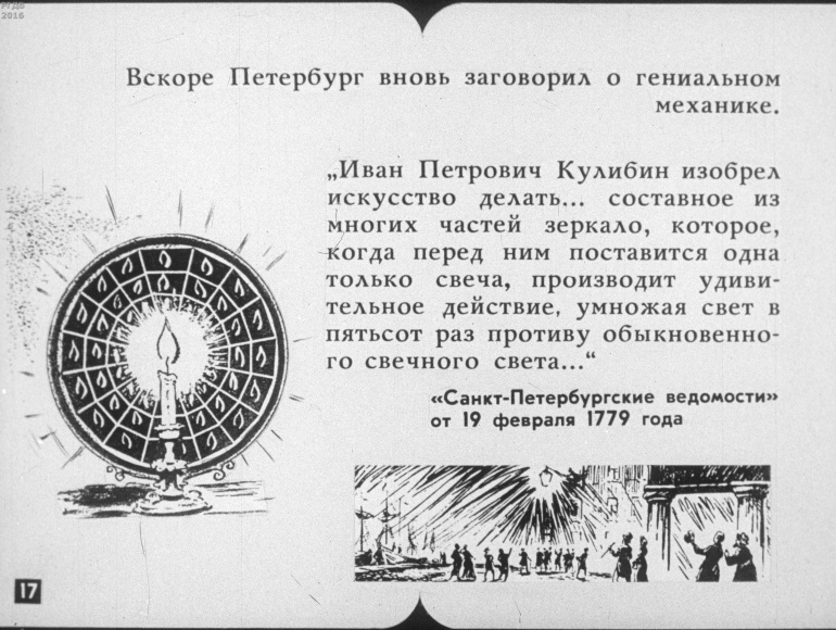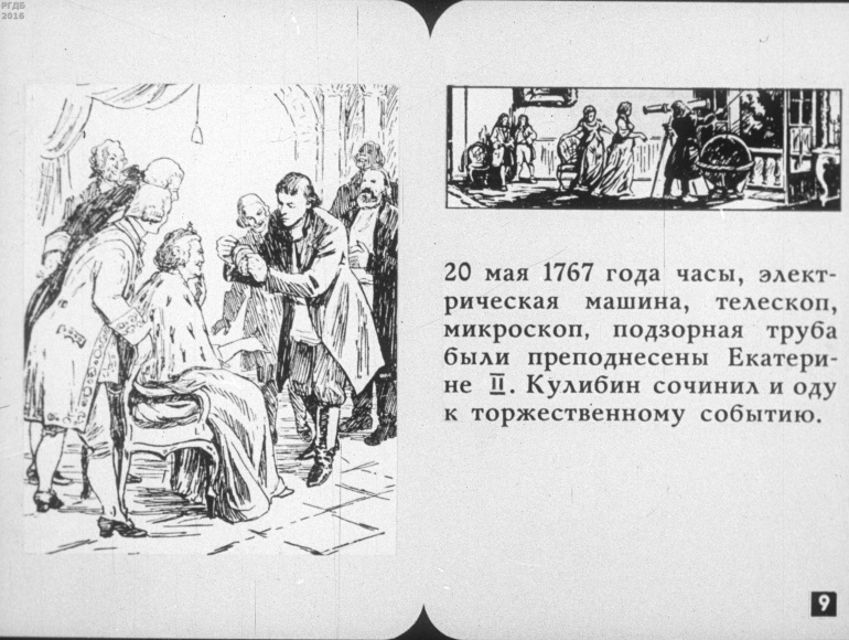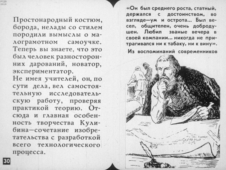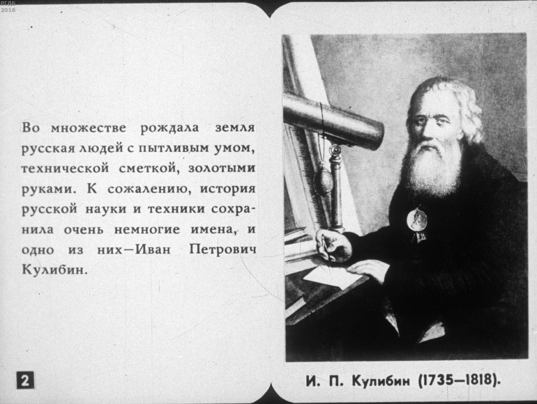 Иван Петрович Кулибин 3 Категория: ДиафильмыПросмотры: 423 Диафильм "Иван Петрович Кулибин".Студия "Диафильм" Госкино СССР, 1985 год. Д-146-85, черно-белый 0-20 копеек