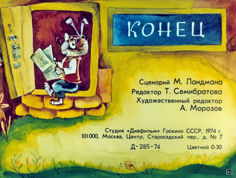 Проделки Братца Кролика 1 Категория: ДиафильмыПросмотры: 1 530 Джоэль Харрис. Диафильм "Проделки Братца Кролика".Студия "Диафильм" Госкино СССР, 1974 год. Д-285-74, цветной 0-30 копеек