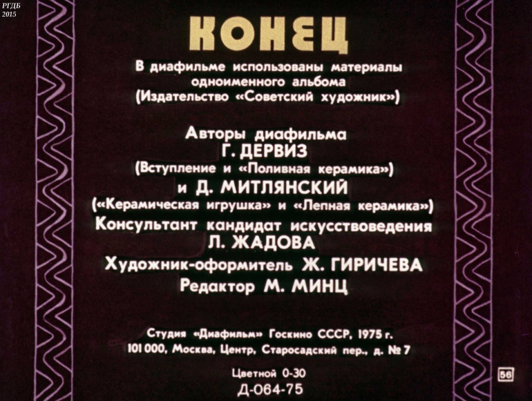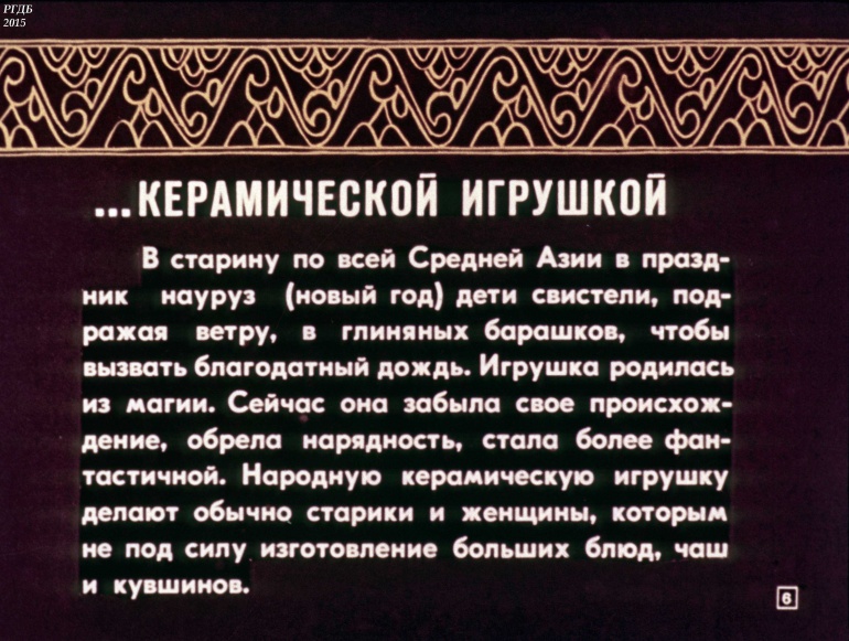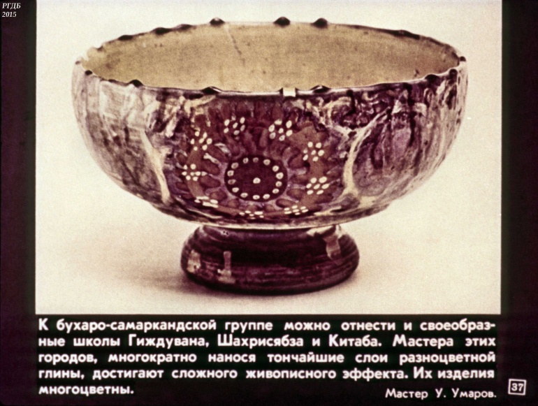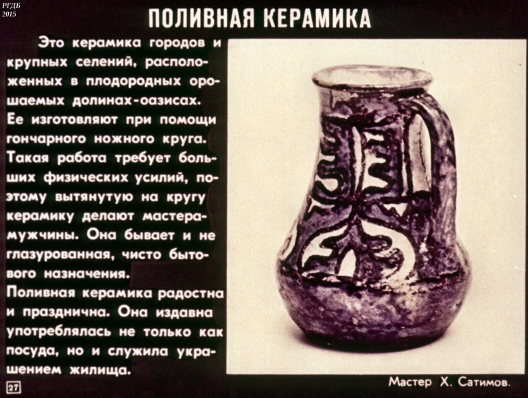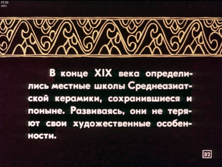 Современная керамика народных мастеров Средней Азии 0 Категория: ДиафильмыПросмотры: 1 682 Диафильм "Современная керамика народных мастеров Средней Азии".Студия "Диафильм" Госкино СССР, 1975 год. Д-064-75, цветной 0-30 копеек