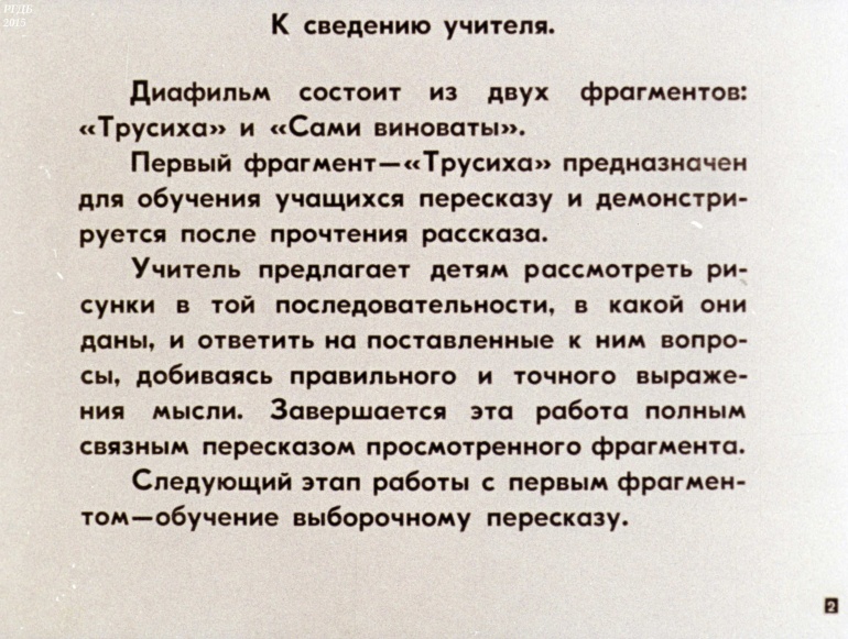 Трусиха 0 Категория: ДиафильмыПросмотры: 1 760 Диафильм "Трусиха" по русскому языку и развитию речи для 1 классаСтудия "Диафильм" Госкино СССР, 1974 год. Д-341-74, цветной 0-30 копеек
