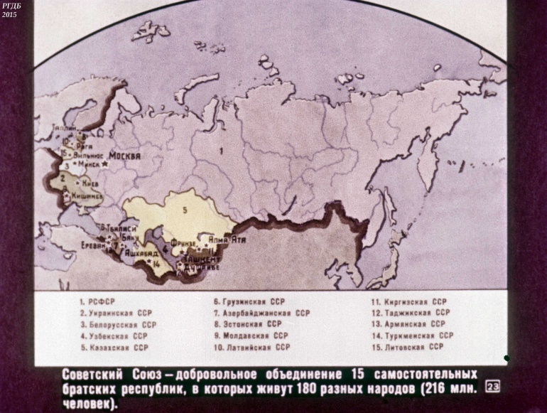 Советский Союз - добровольное объединение 15 самостоятельных братских республик, в которых живут 180 разных народов (216 млн. человек)