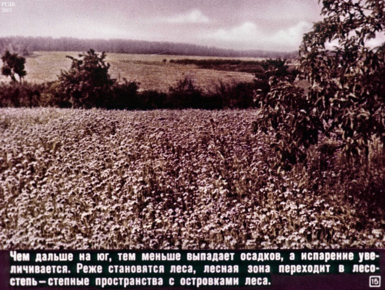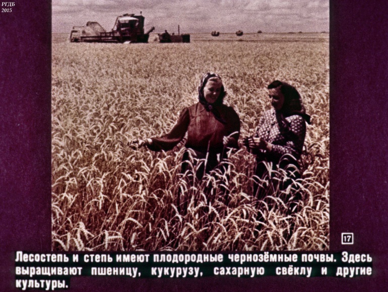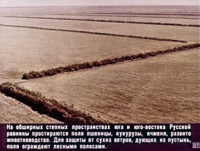 На обширных степных пространствах юга и юго-востока Русской равнины простираются поля пшеницы, кукурузы, ячменя, развито животноводство. Для защиты от сухих ветров, дующих из пустынь, поля ограждают лесными полосами.![]()