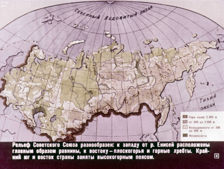 Рельеф Советского Союза разнообразен: к западу от реки Енисей расположены главным образом равнины, к востоку - плоскогорья и горные хребты. Крайний юг и восток страны заняты высокогорным поясом.![]()