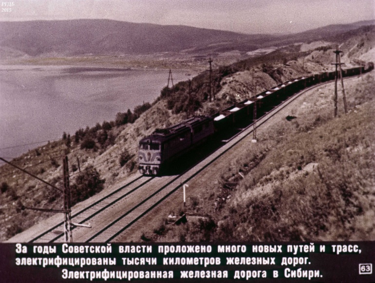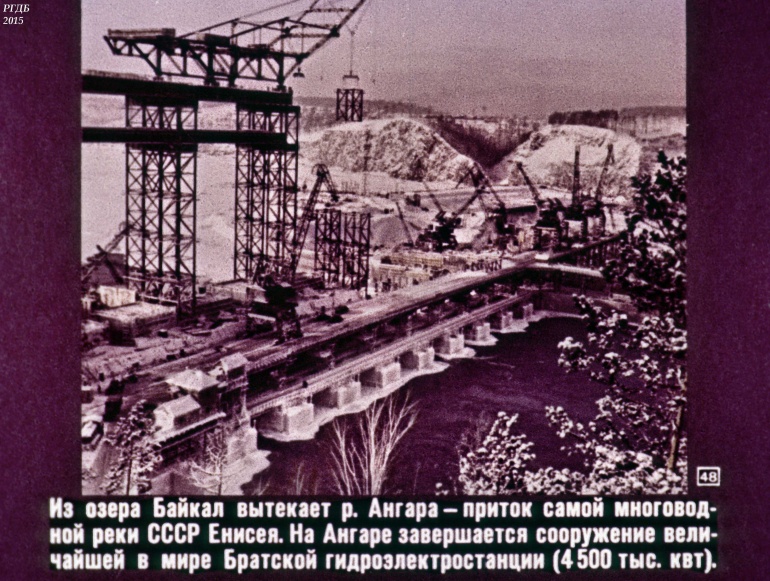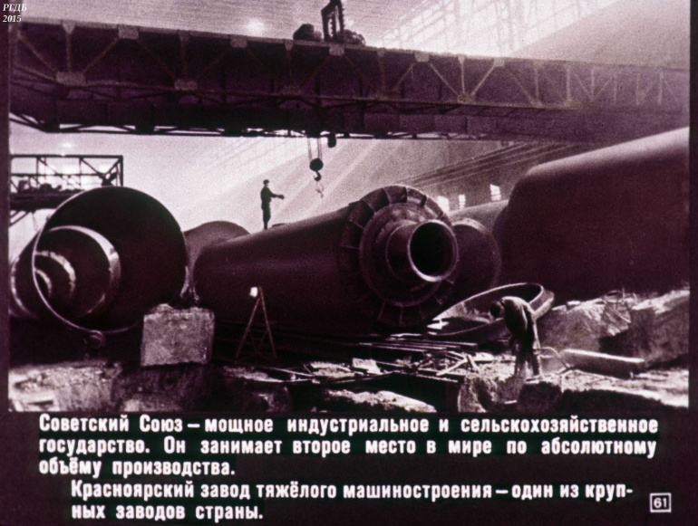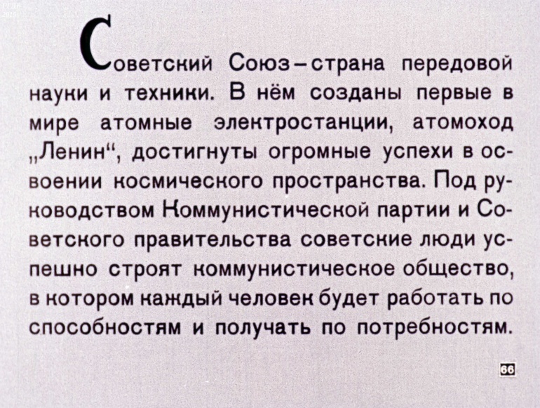 Советский Союз - страна передовой науки и техники. В нём созданы первые в мире атомные электростанции, атомоход „Ленин", достигнуты огромные успехи в освоении космического пространства. Под руководством Коммунистической партии и Советского правительства советские люди успешно строят коммунистическое общество, в котором каждый человек будет работать по способностям и получать по потребностям.![]()
