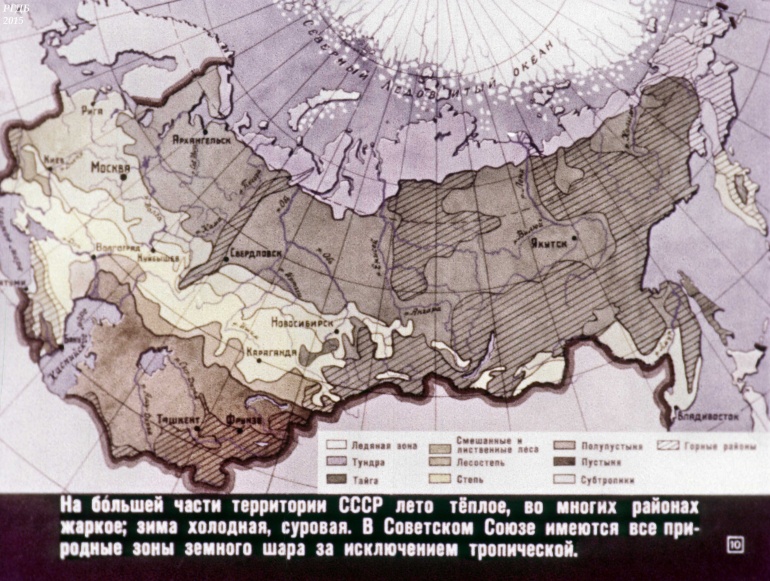 На большей части территории СССР лето тёплое, во многих районах жаркое; зима холодная, суровая. В Советском Союзе имеются все природные зоны земного шара за исключением тропической.![]()