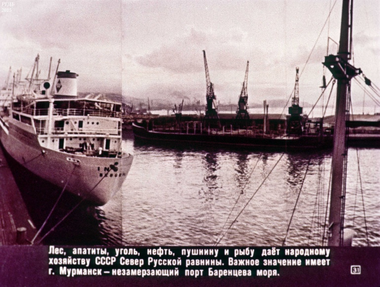 Лес, апатиты, уголь, нефть, пушнину и рыбу даёт народному хозяйству СССР Север Русской равнины. Важное значение имеет г. Мурманск - незамерзающий порт Баренцева моря.![]()