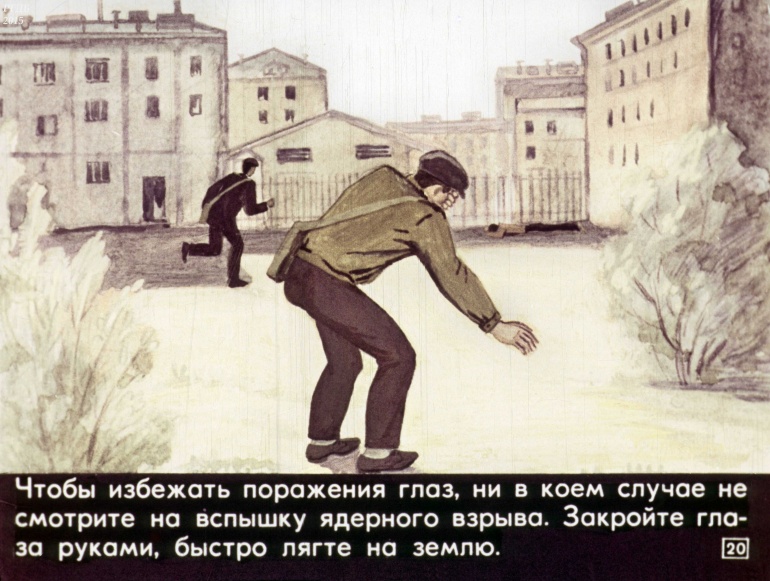 Чтобы избежать поражения глаз, ни в коем случае не смотрите на вспышку ядерного взрыва. Закройте глаза руками, быстро лягте на землю.![]()
