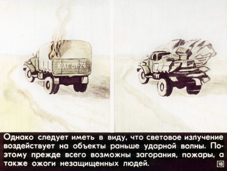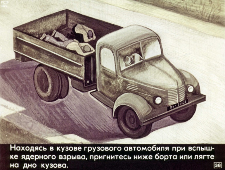 Находясь в кузове грузового автомобиля при вспышке ядерного взрыва, пригнитесь ниже борта или лягте на дно кузова.![]()