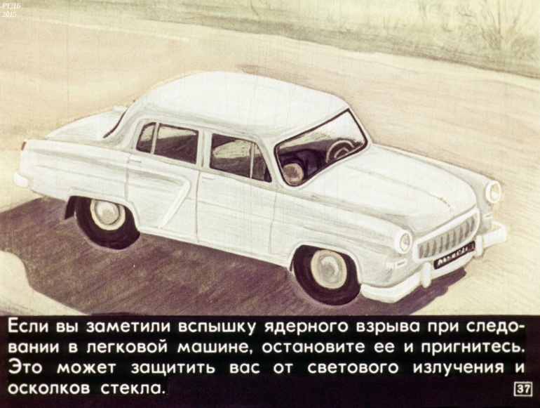 Если вы заметили вспышку ядерного взрыва при следовании в легковой машине, остановите ее и пригнитесь. Это может защитить вас от светового излучения и осколков стекла.![]()