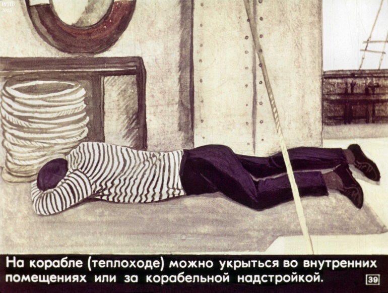 На корабле (теплоходе) можно укрыться во внутренних помещениях или за корабельной надстройкой.![]()