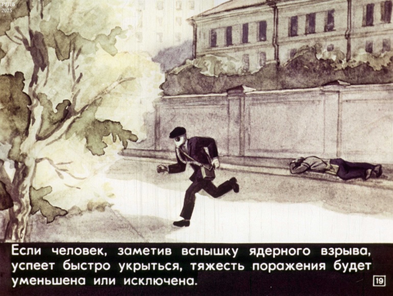 Если человек, заметив вспышку ядерного взрыва, успеет быстро укрыться, тяжесть поражения будет уменьшена или исключена.![]()