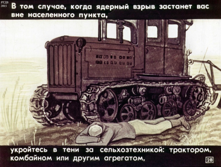 В том случае, когда ядерный взрыв застанет вас вне населенного пункта, укройтесь в тени за сельхозтехникой: трактором,комбайном или другим агрегатом,![]()