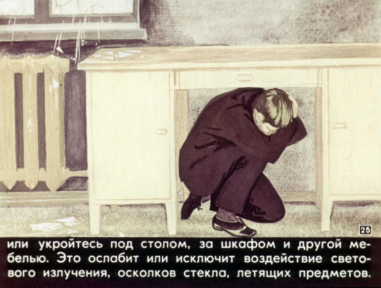или укройтесь под столом, за шкафом и другой мебелью. Это ослабит или исключит воздействие светового излучения, осколков стекла, летящих предметов.![]()