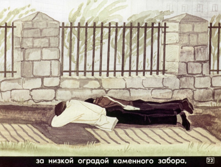 за низкой оградой каменного забора,![]()