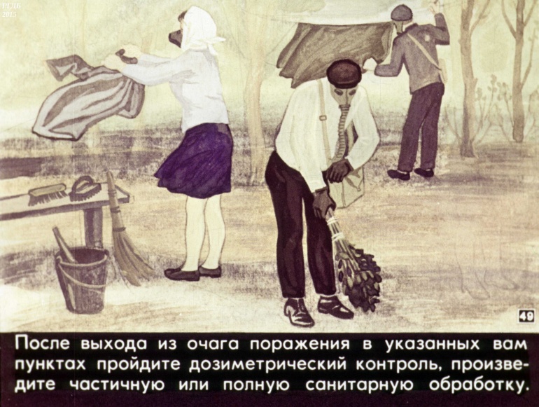 После выхода из очага поражения в указанных вам пунктах пройдите дозиметрический контроль, произведите частичную или полную санитарную обработку.![]()