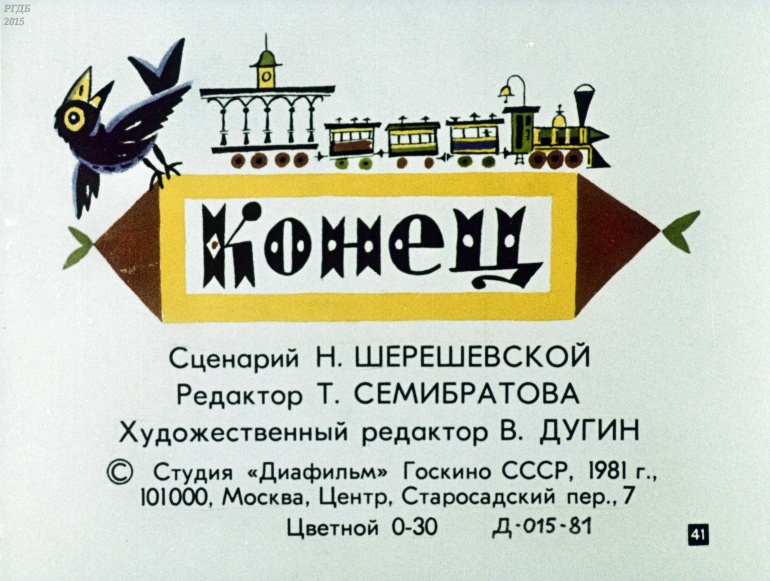 Две сказки. Про вокзал, который не стоял на месте 0 Категория: ДиафильмыПросмотры: 1 499 Диафильм "Две сказки. Про вокзал, который не стоял на месте. Всё кувырком". Д. БиссетСтудия "Диафильм" Госкино СССР, 1981 год. Д-015-81, цветной 0-30 копеек