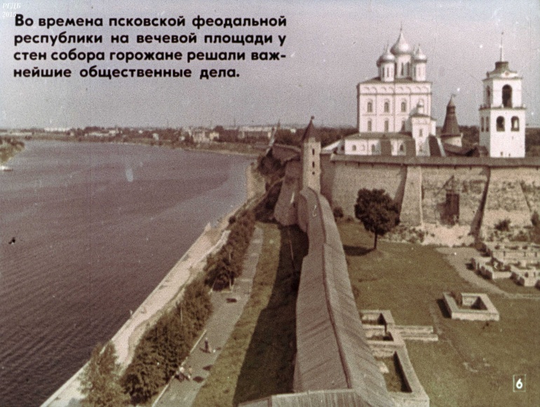 Во времена псковской феодальной республики на вечевой площади у стен собора горожане решали важнейшие общественные дела.