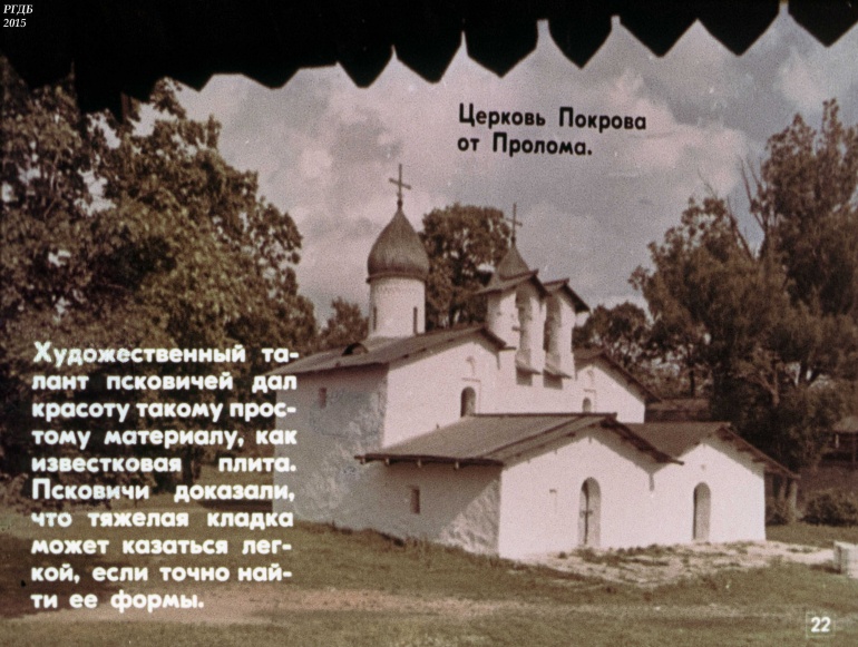 Художественный талант псковичей дал красоту такому простому материалу, как известковая плита. Псковичи доказали, что тяжелая кладка может казаться легкой, если точно найти ее формы. Церковь Покрова от Пролома.