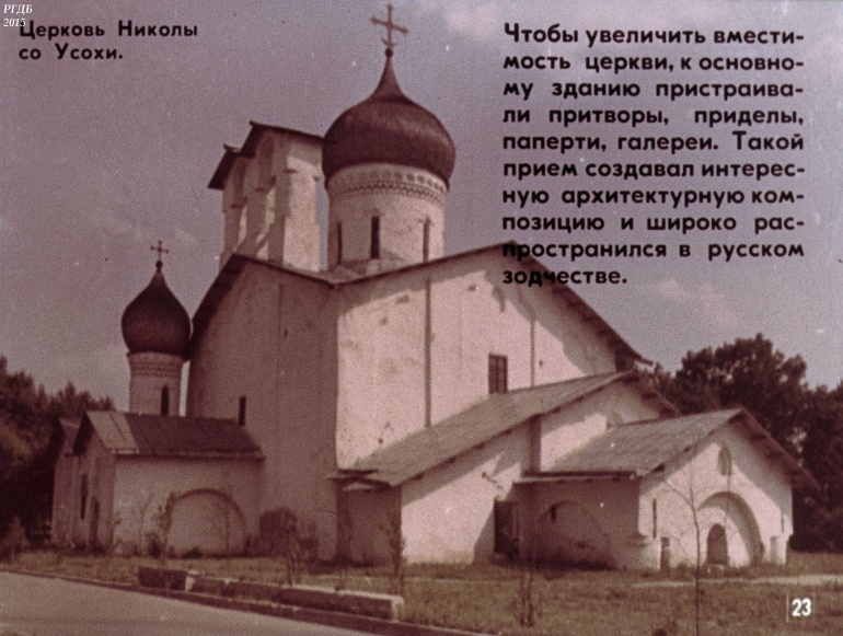 Чтобы увеличить вместимость церкви, к основному зданию пристраивали притворы, приделы, паперти, галереи. Такой прием создавал интересную архитектурную композицию и широко распространился в русском зодчестве. Церковь Николы со Усохи.