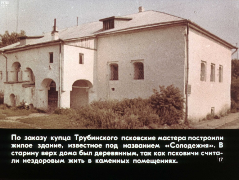 По заказу купца Трубинского псковские мастера построили жилое здание, известное под названием «Солодежня». В старину верх дома был деревянным, так как псковичи считали нездоровым жить в каменных помещениях.