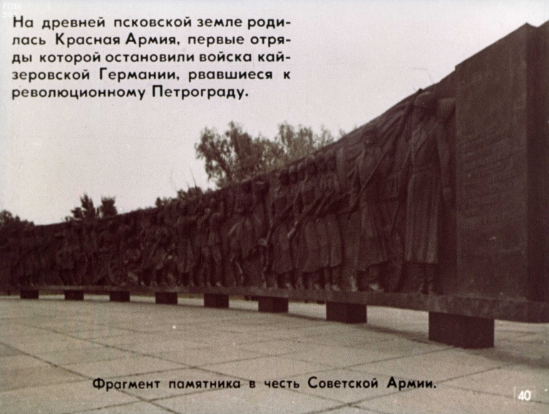 На древней псковской земле родилась Красная Армия, первые отряды которой остановили войска кайзеровской Германии, рвавшиеся к революционному Петрограду. Фрагмент памятника в честь Советской Армии.