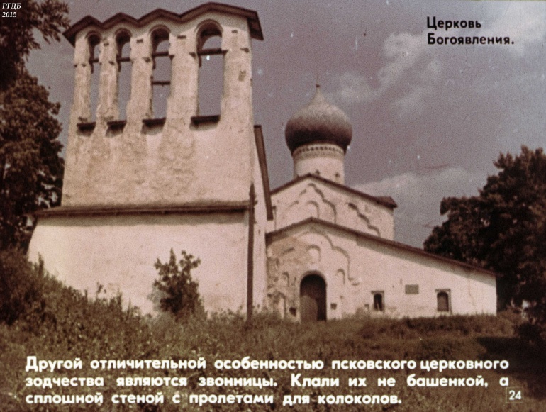 Другой отличительной особенностью псковского церковного зодчества являются звонницы. Клали их не башенкой, а сплошной стеной пролетами для колоколов. Церковь Богоявления.