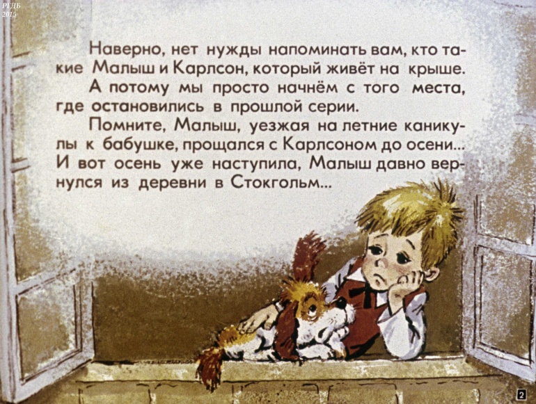 Карлсон вернулся. Часть 1-я 6 Категория: ДиафильмыПросмотры: 2 123 Диафильм "Карлсон вернулся. Часть 1-я". По мотивам повести Астрид ЛиндгренСтудия "Диафильм" Госкино СССР, 1982 год. Д-261-82, цветной 0-30 копеек