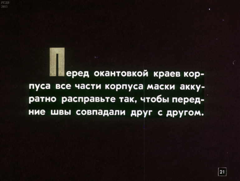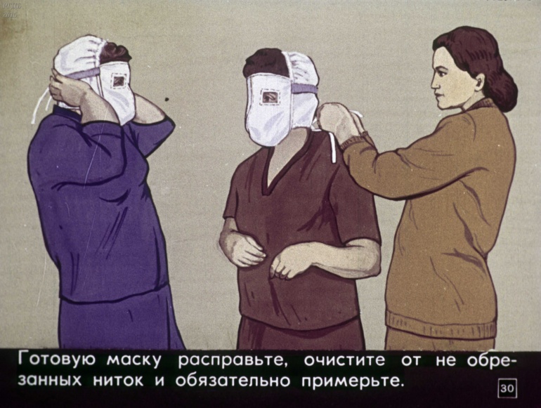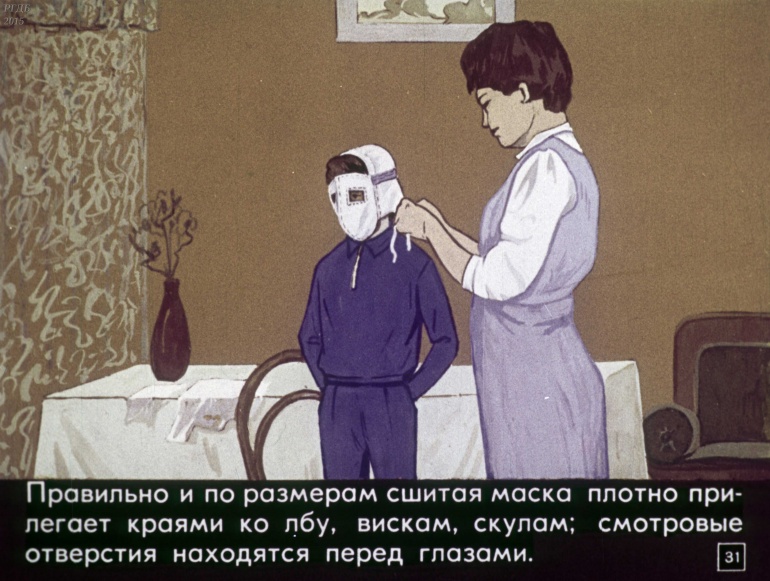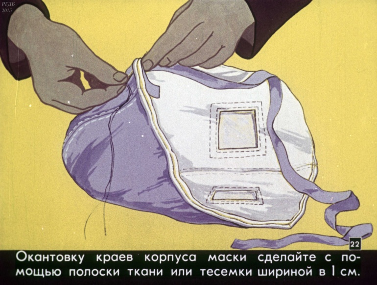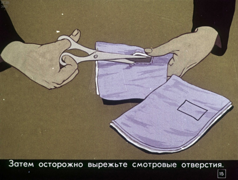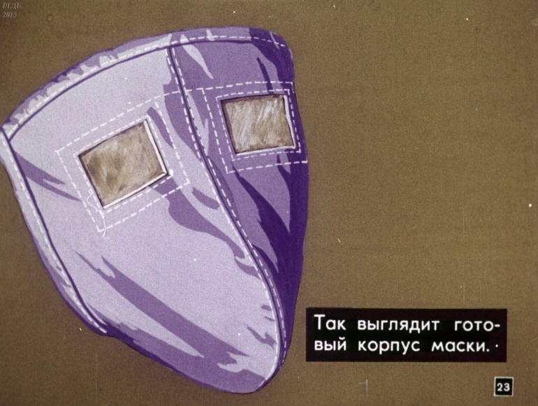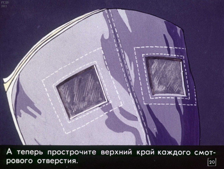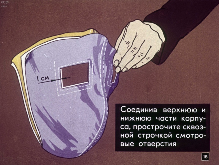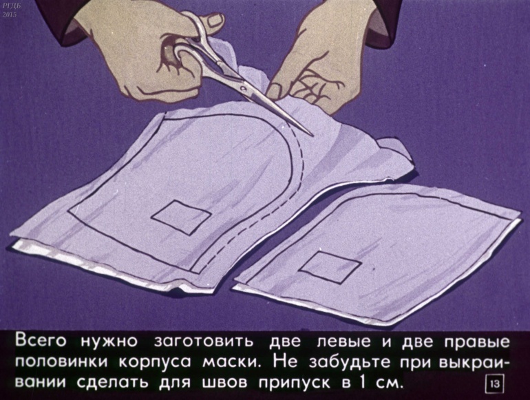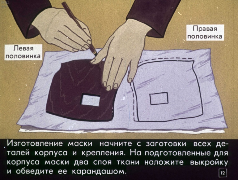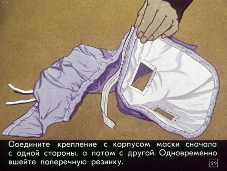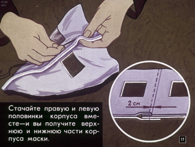 Правильно и по размерам сшитая маска плотно прилегает краями ко лбу, вискам, скулам; смотровые отверстия находятся перед глазами.