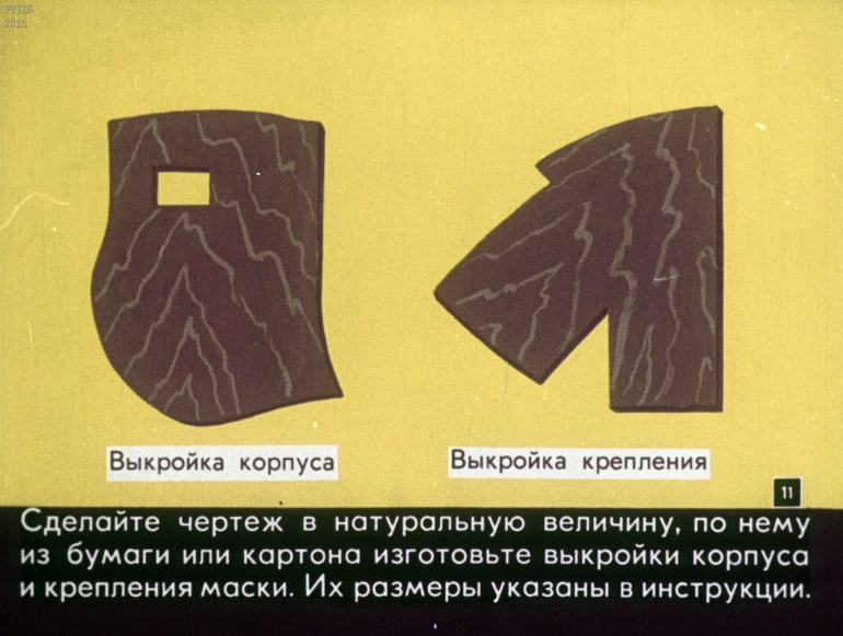 Сделайте чертеж в натуральную величину, по нему из бумаги или картона изготовьте выкройки корпуса и крепления маски. Их размеры указаны в инструкции.