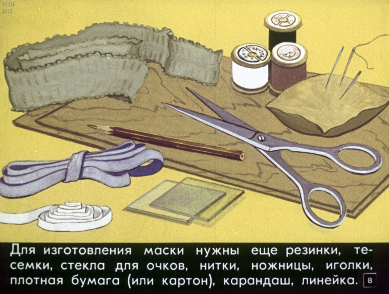 Для изготовления маски нужны еще резинки, тесемки, стекла для очков, нитки, ножницы, иголки, плотная бумага (или картон), карандаш, линейка.
