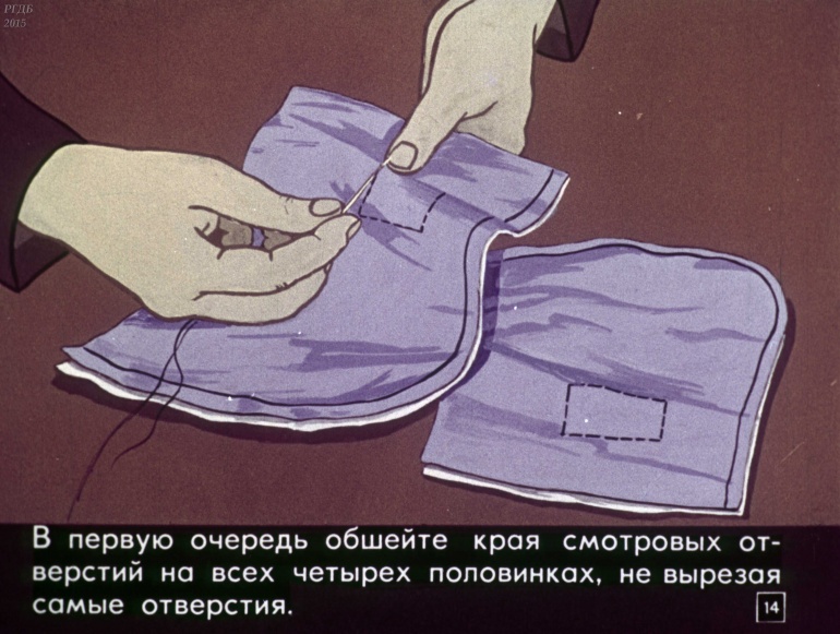 В первую очередь обшейте кроя смотровых отверстий на всех четырех половинках, не вырезая самые отверстия.