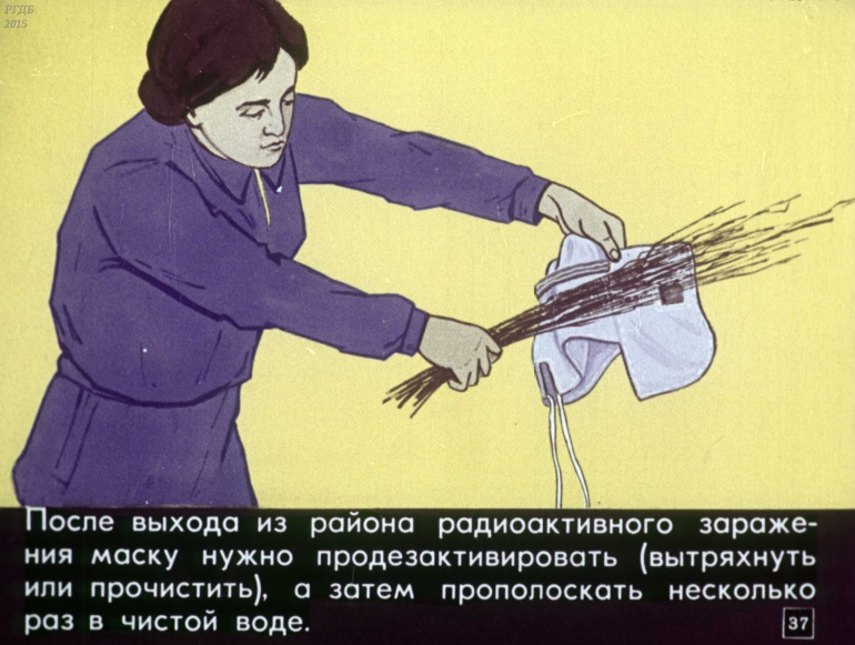 После выхода из района радиоактивного заражения маску нужно продезактивировать (вытряхнуть или прочистить), а затем прополоскать несколько раз в чистой воде.