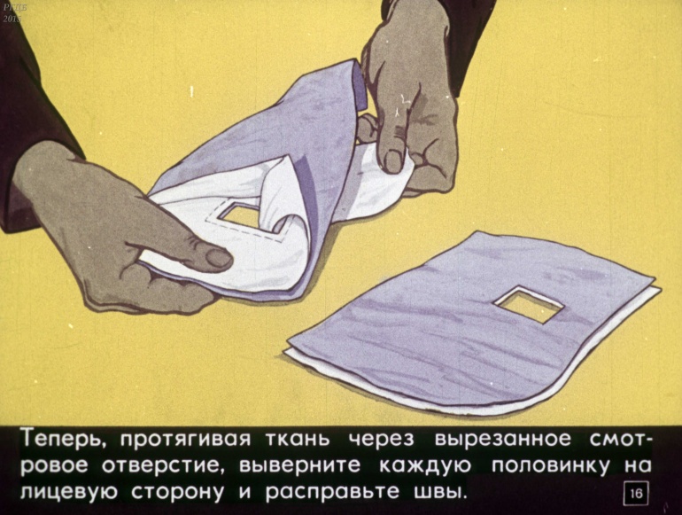 Теперь, протягивая ткань через вырезанное смотровое отверстие, выверните каждую половинку на лицевую сторону и расправьте швы.