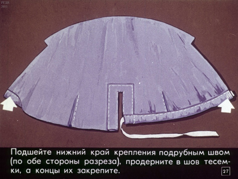 Подшейте нижний край крепления подрубным швом (по обе стороны разреза), продерните в шов тесемки, а концы их закрепите.