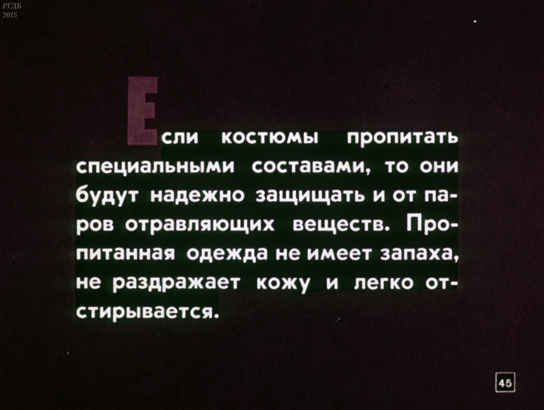 Если костюмы пропитать специальными составами, то они будут надежно защищать и от паров отравляющих веществ. Пропитанная одежда не имеет запаха, не раздражает кожу и легко отстирывается.