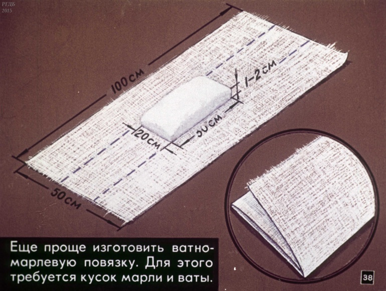 Еще проще изготовить ватномарлевую повязку. Для этого требуется кусок марли и ваты.