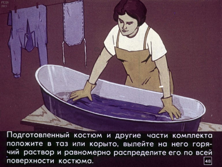 Подготовленный костюм и другие части комплекта положите в таз или корыто, вылейте на него горячий раствор и равномерно распределите его. по всей поверхности костюма. Отожмите костюм, выверните его наизнанку и снова пропитайте. Внимательно следите за тем, чтобы не осталось сухих, не пропитанных мест.