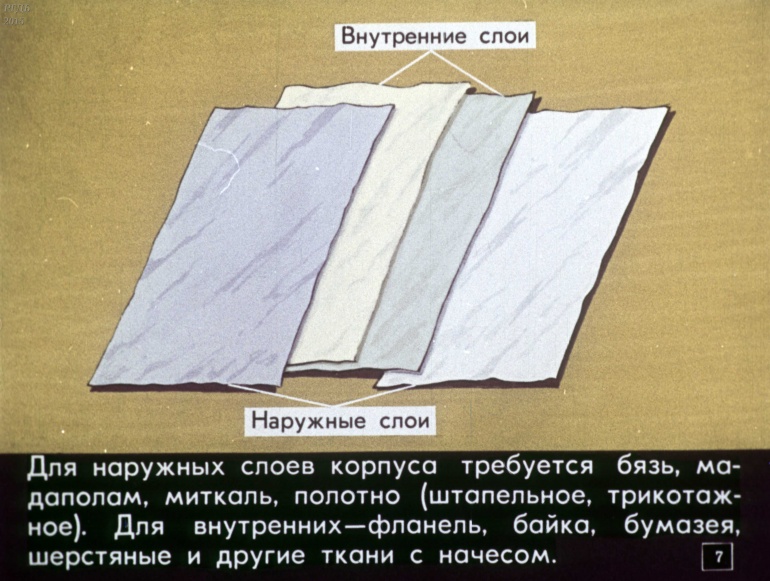 Для наружных слоев корпуса требуется бязь, мадаполам, миткаль, полотно (штапельное, трикотажное). Для внутренних — фланель, байка, бумазея, шерстяные и другие ткани с начесом.