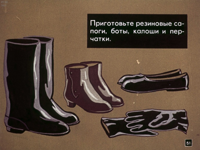 Приготовьте резиновые сапоги, боты, калоши и перчатки.