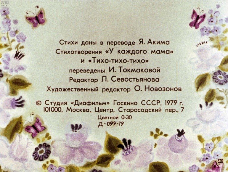 Мамин день 0 Категория: ДиафильмыПросмотры: 1 234 Г. Виеру. Диафильм "Мамин день"Студия "Диафильм" Госкино СССР, 1979 год. Д-099-79, цветной 0-30 копеек