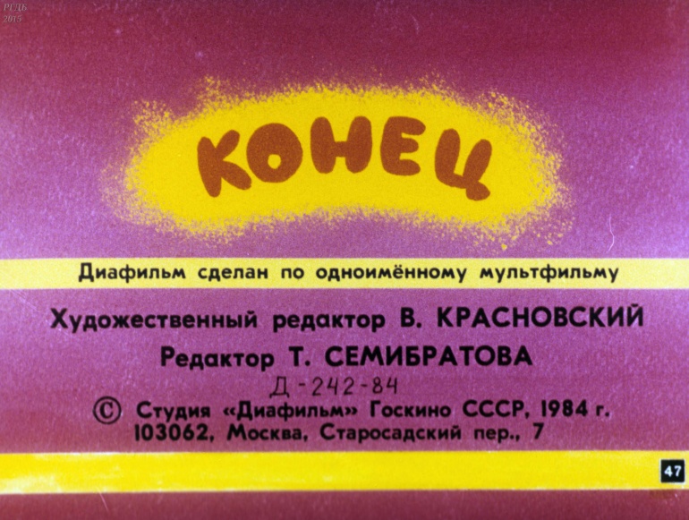 Ну, погоди! 6 19 Категория: ДиафильмыПросмотры: 5 401 Диафильм "Ну, погоди!". Выпуск 6Студия "Диафильм" Госкино СССР, 1984 год. Д-242-84, цветной 0-30 копеек