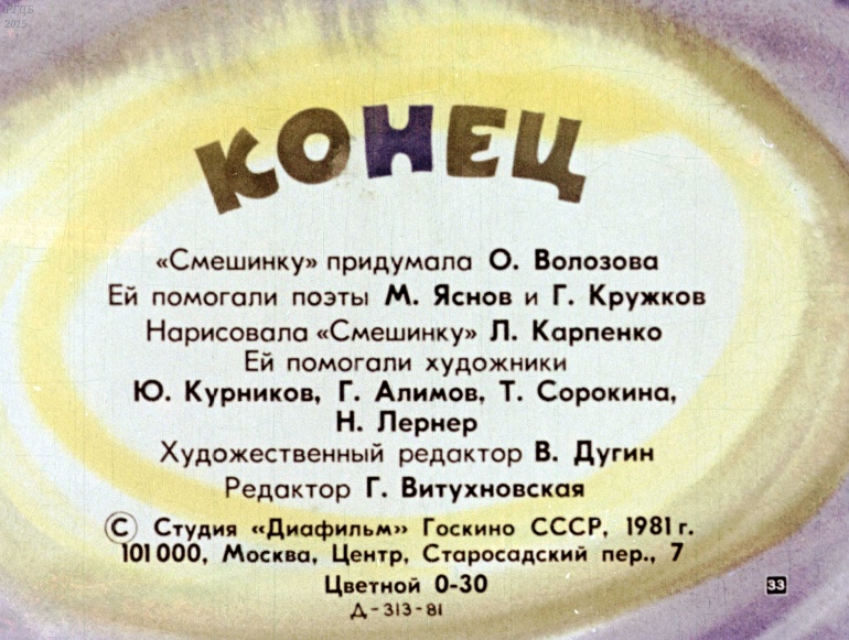 Смешинка-32 0 Категория: ДиафильмыПросмотры: 1 151 Диафильм "Смешинка-32".Студия "Диафильм" Госкино СССР, 1981 год. Д-313-81, цветной 0-30 копеек