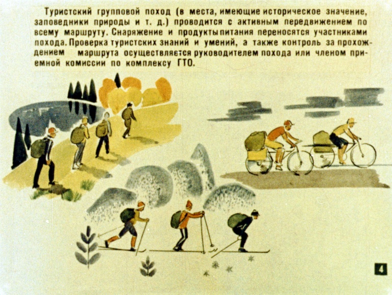 Туристский групповой поход (в места, имеющие историческое значение, заповедники природы и т. д.) проводится с активным передвижением по всему маршруту. Снаряжение и продукты питания переносятся участниками похода. Проверка туристских знаний и умений, а также контроль за прохож дением маршрута осуществляется руководителем похода или членом приемной комиссии по комплексу ГТО.