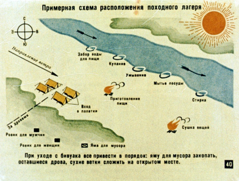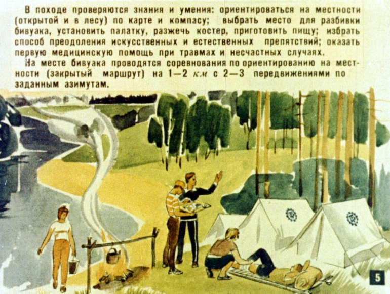 В походе проверяются знания и умения: ориентироваться на местности (открытой и в лесу) по карте и компасу; выбрать место для разбивки бивуака, установить палатку, разжечь костер, приготовить пищу; избрать способ преодоления искусственных и естественных препятствий; оказать первую медицинскую помощь при травмах и несчастных случаях.