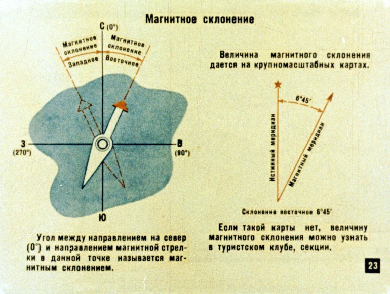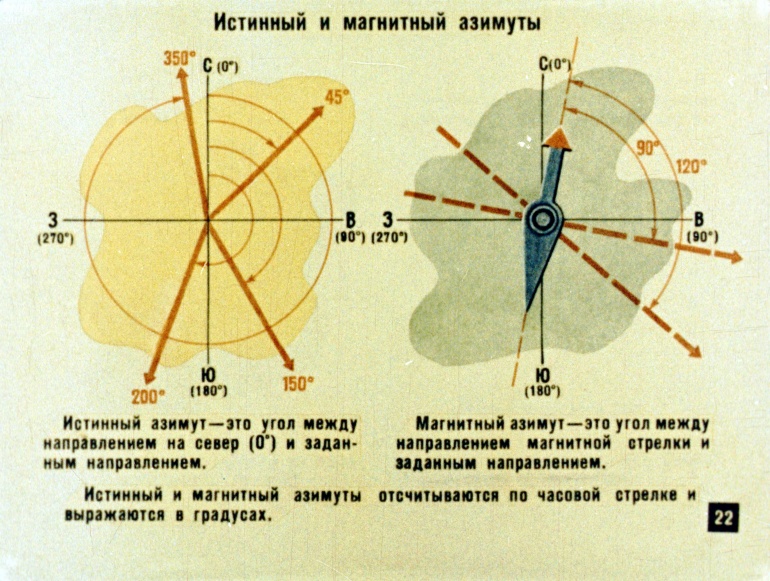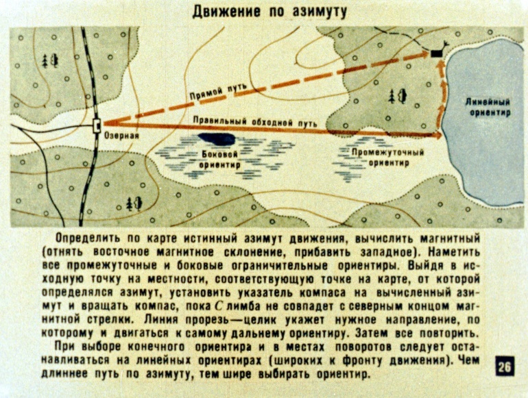 Определить по карте истинный азимут движения, вычислить магнитный (отнять восточное магнитное склонение, прибавить западное). Наметить все промежуточные и боковые ограничительные ориентиры. Выйдя в исходную точку на местности, соответствующую точке на карте, от которой определялся азимут, установить указатель компаса на вычисленный азимут и вращать компас, пока С лимба не совпадет с северным концом магнитной стрелки. Линия прорезь—целик укажет нужное направление, по которому и двигаться к самому дальнему ориентиру. Затем 8се повторить.