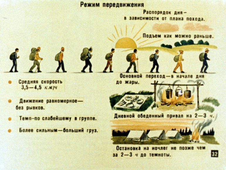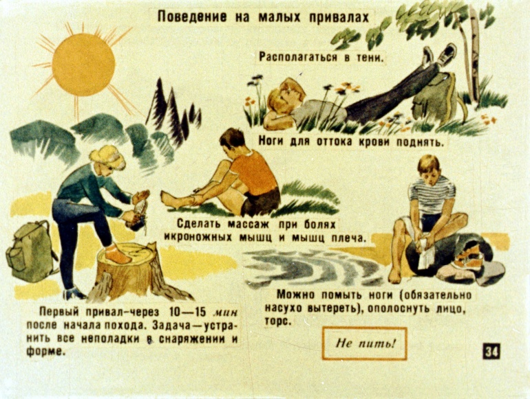 - Первый привал-через 10—15 мин после начала похода. Задача — устранить все неполадки в снаряжении и форме.