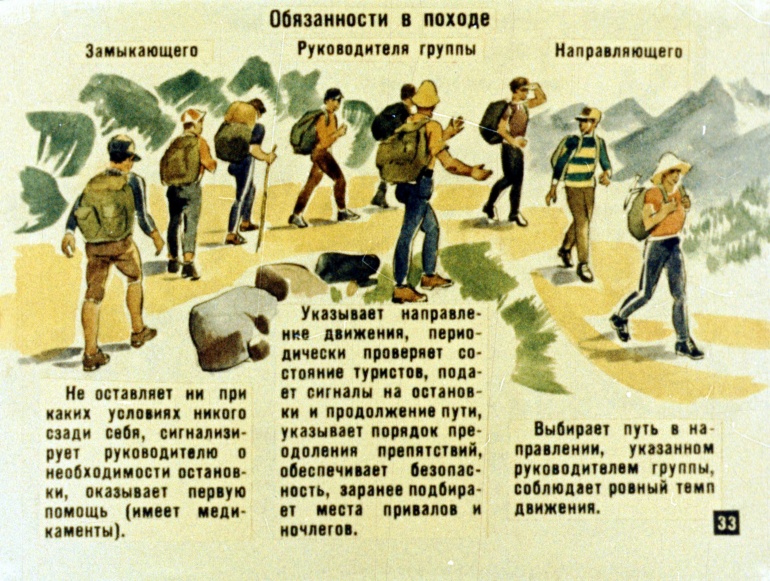 Замыкающего - Не оставляет ни при каких условиях никого сзади себя, сигнализирует руководителю о необходимости остановки, оказывает первую помощь (имеет медикаменты).